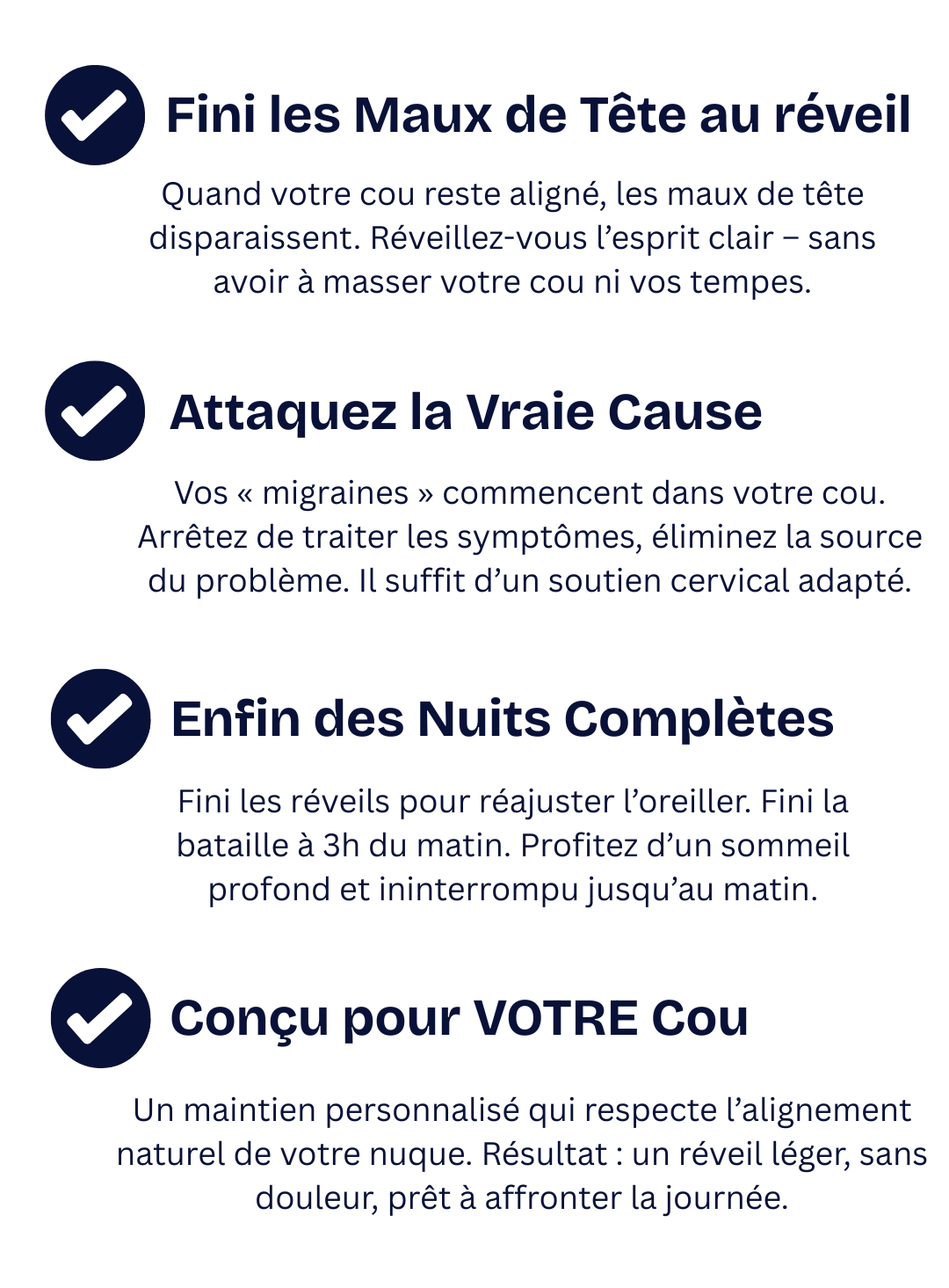 Pendant 12 ans, j’ai souffert de douleurs cervicales 24h/24. Chaque réveil était un cauchemar avec des douleurs atroces à la base du crâne. Aujourd’hui ? Je me lève et je vis, tout simplement. Plus de mouvements précautionneux, plus de médicaments au réveil, plus de bouillotte. Juste la liberté d’un matin sans douleur.